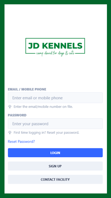 If you are a new client booking your pets' first stay with JD Kennels, please click the grey ‘SIGN UP’ button to create an account.